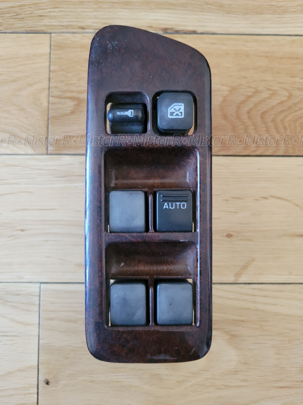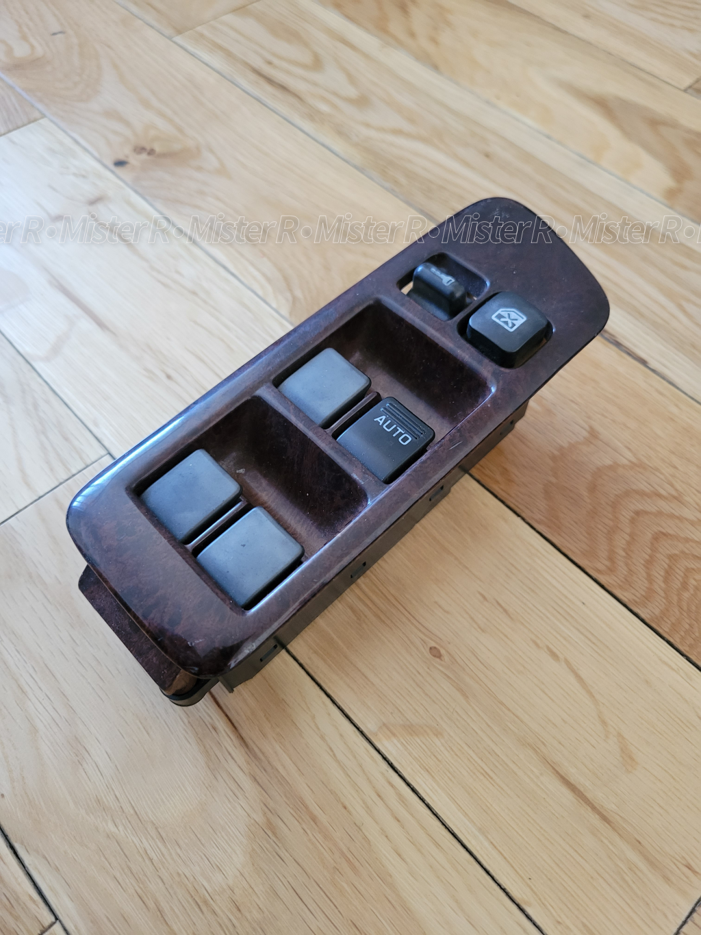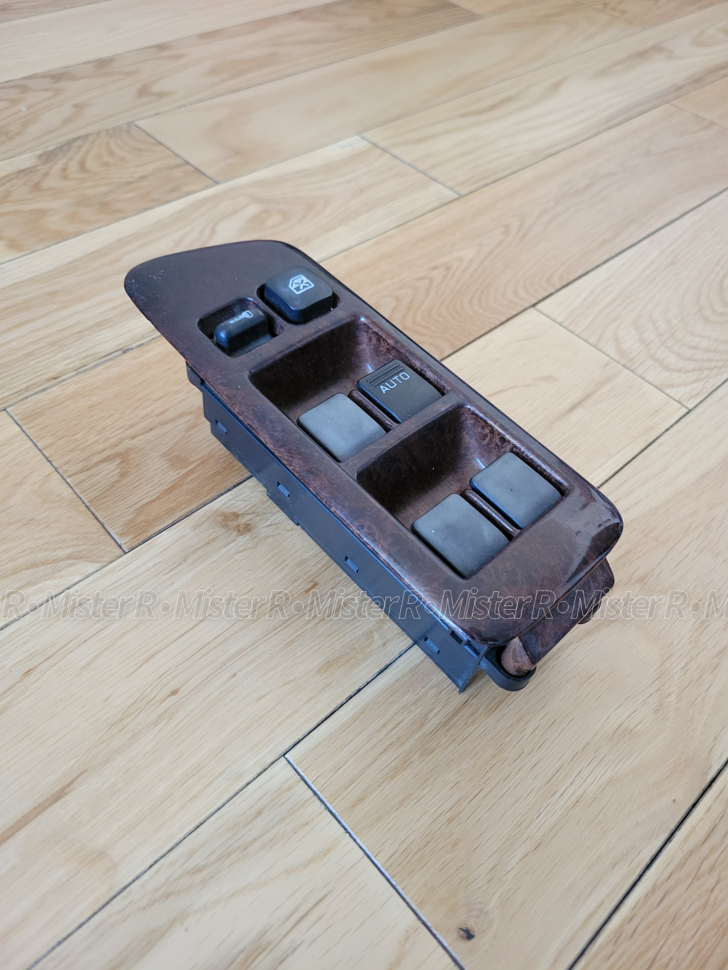 Pre-owned Nissan A32 Maxima, Driver/Right Master Power Window Switch. This part is an OE Japanese part from a RHD vehicle. Trim piece is in woodgrain, no cracks or chips, buttons of window switch fully intact, buttons have some fading/discoloration, 8/10 condition. Note that this part is untested by us and is being listed for parts/not working. Original and genuine JDM item from Nissan, imported stateside by Mister R.
